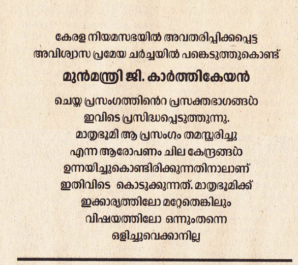 പക്ഷേ, 2005 ജൂലൈ 19ന് നിയമസഭയില് പ്രസംഗിച്ച ജി കാര്ത്തികേയന് ആ ഭാഗ്യം ഉണ്ടായില്ല. മാതൃഭൂമി ആ പ്രസംഗം ക്ലീനായി തമസ്കരിച്ചു. പിന്നീടതു വിവാദമായി. തടിയൂരാന് പ്രസംഗം കഴിഞ്ഞ് പതിനാറാം നാള് അതു റിപ്പോര്ട്ടു ചെയ്തു. എഡിറ്റ് പേജില്.